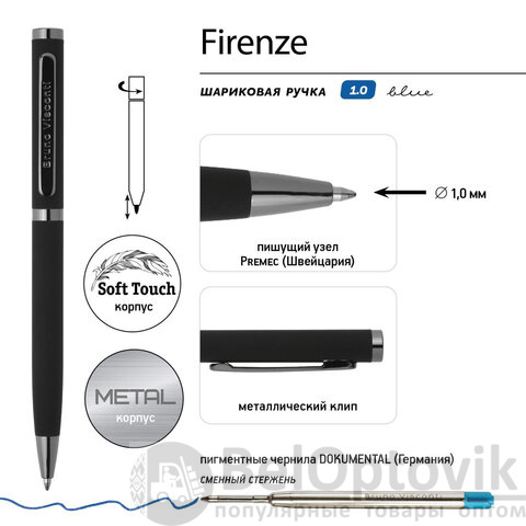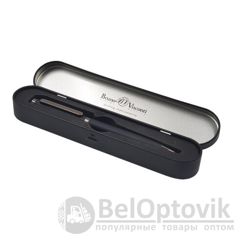BRUNO VISCONTI "Firenze" – автоматическая ручка с легким поворотным механизмом подачи стержня. Надежный пишущий узел диаметром 1,0 мм скользит по поверхности бумаги, оставляя ровную, четкую линию. Ручка в подарочном металлическом футляре с ложементом.