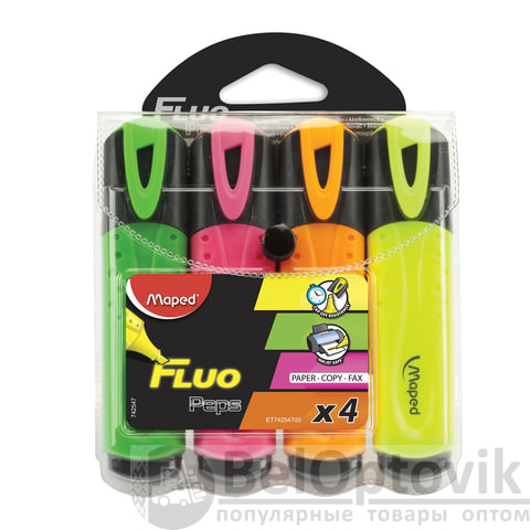 Текстовыделители MAPED "Fluo Pep's Classic" предназначен для любого типа бумаги, бумаги для факса и компьютерных распечаток, в том числе, отпечатанных на лазерных и струйных принтерах. Набор из 4 цветов ассорти.