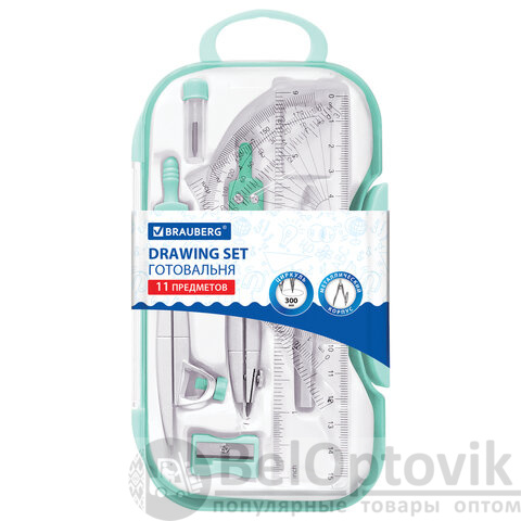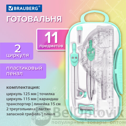 Готовальня BRAUBERG SCHOOL KIT, 11 предметов, циркуль 115 мм, циркуль 125 мм, чертежные принадлежности, мятный цвет, 210706