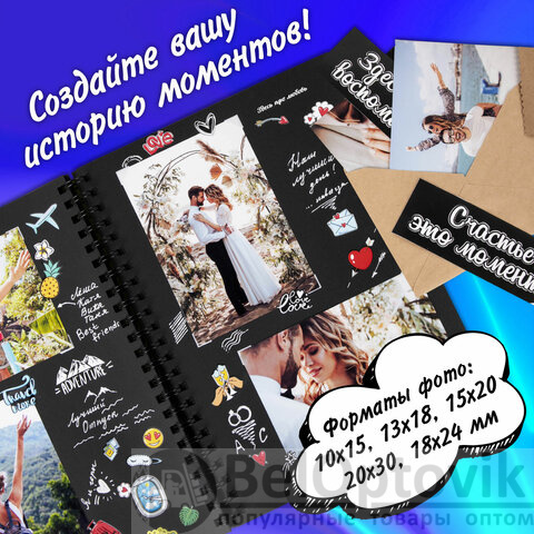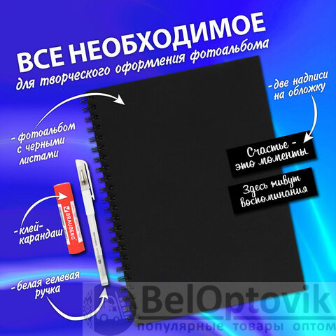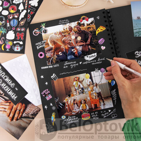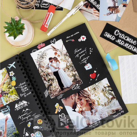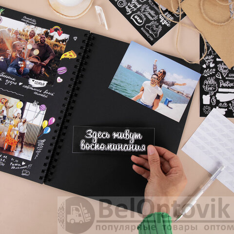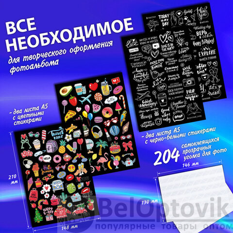 В комплекте с фотоальбомом: 2 надписи на обложку альбома (размером 3,7x13,2 см), 2 листа (формата А5) черно-белых и 2 листа (формата А5) цветных стикеров, 204 самоклеящихся прозрачных уголка для фото, белая гелевая ручка и клей-карандаш. Обложка фотоальбома плотная – 500 г/м2, плотность внутренних листов – 200 г/м2. С помощью дополнительных аксессуаров можно сделать фотоальбом уникальным.