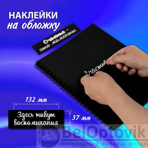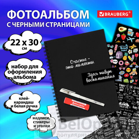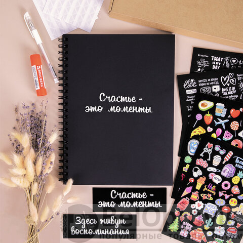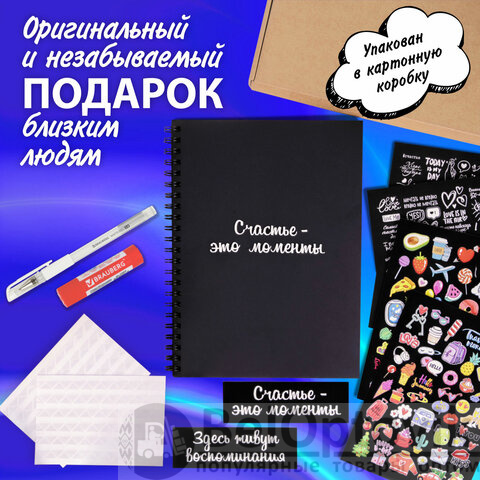 Фотоальбом "Счастье - это моменты" 24 чёрных листа 22x30, уголки, стикеры, ручка, клей, BRAUBERG, 391310
