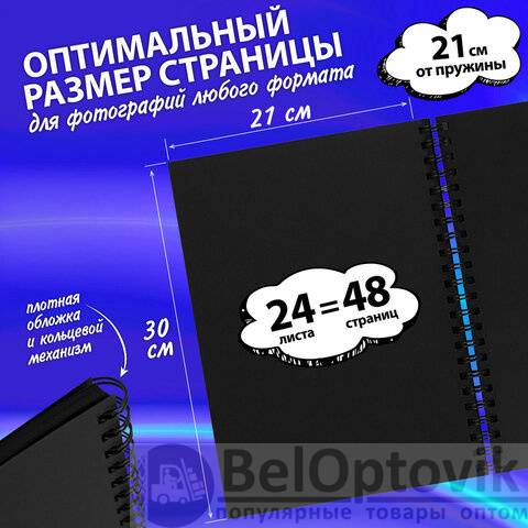 Фотоальбом на пружине состоит из 24 бумажных листов 22x30 см черного цвета без карманов, что позволяет разместить фотографии разных размеров на одной странице, оставлять ручные надписи, рисунки, а также наклеивать креативные стикеры.