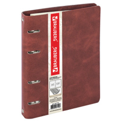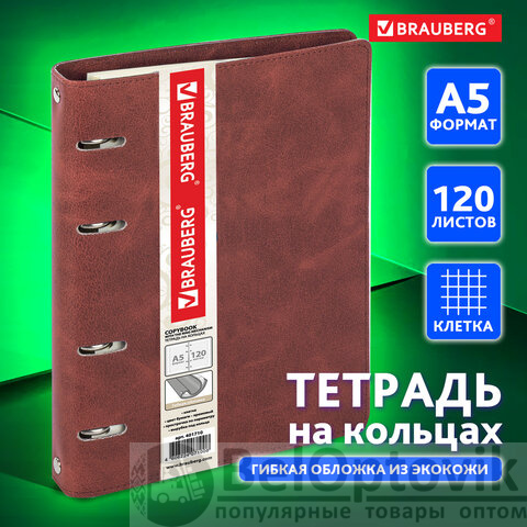 Тетрадь на кольцах А5 (180х220 мм), 120 листов, под кожу, клетка, BRAUBERG "Main", коричневый, 401710