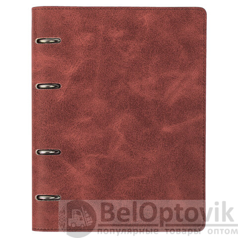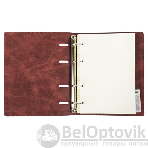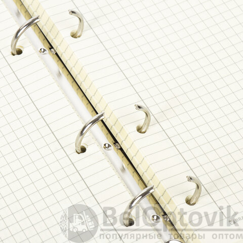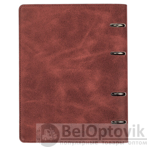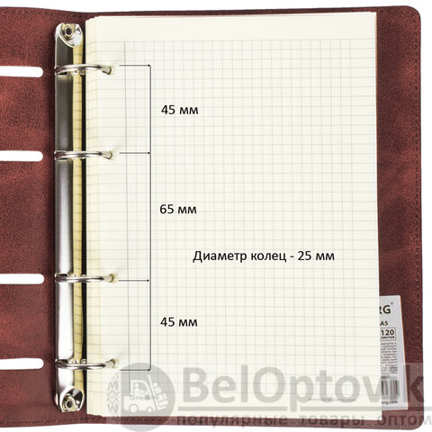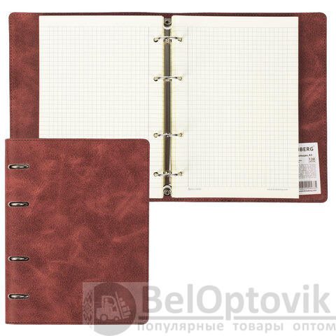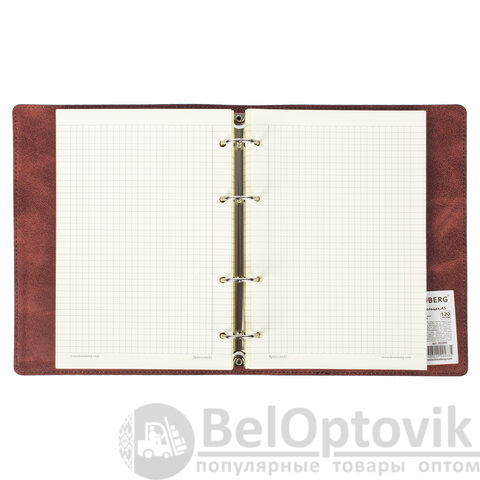 Блок состоит из 120 листов офсетной бумаги кремового цвета плотностью 70 г/м2. Линовка - клетка с полями. Мягкая интегральная обложка с прошивкой по периметру и вырубкой под кольца выполнена из износоустойчивого материала с текстурой под гладкую кожу коричневого цвета. Формат А5 является стандартным и обеспечивает комфортное ношение в рюкзаке/ранце или папке. Оборудована кольцевым механизмом с 4-мя кольцами для подшивки сменных блоков, что позволит носить на учебу/работу всего одну тетрадь с возможностью добавлять и менять листы.