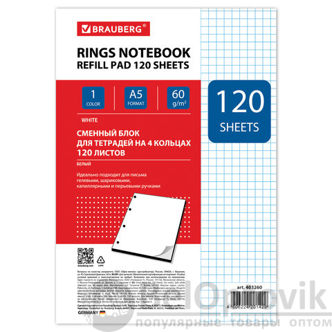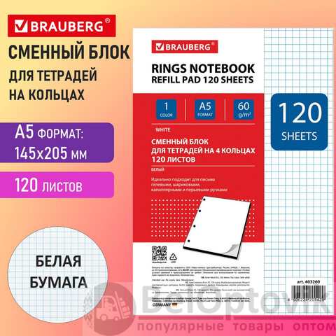 Сменный блок для тетради на кольцах, А5, 120 л., BRAUBERG, "Белый", 403260