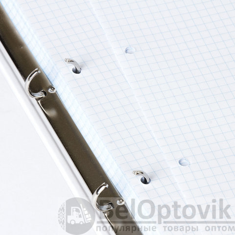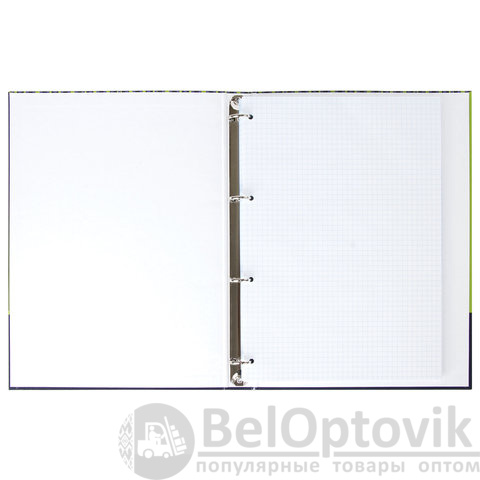 Блок состоит из 100 листов офсетной бумаги белого цвета плотностью 60 г/м2. Линовка – клетка. Жесткая книжная обложка выполнена из переплетного картона и покрыта глянцевой пленкой. Увеличенный формат А4 предназначен для ведения большего объема записей. Оборудована кольцевым механизмом с 4 кольцами для подшивки сменных блоков, что позволит носить на учебу или работу всего одну тетрадь с возможностью добавлять и менять листы. Диаметр колец составляет 25 мм.