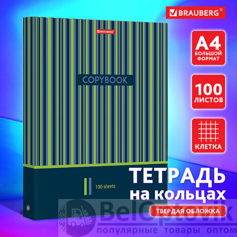 Тетрадь на кольцах БОЛЬШАЯ А4 (225х300 мм), 100 листов, твердый картон, клетка, BRAUBERG, Полосы, 403273