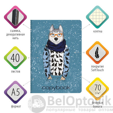 Тетрадь 40 л. в клетку обложка SoftTouch, бежевая бумага 70 г/м2, сшивка, А5 (147х210 мм), ВОЛК В ОЧКАХ, BRAUBERG, 403767