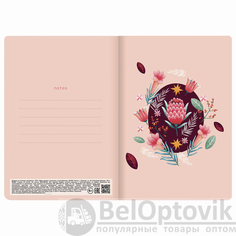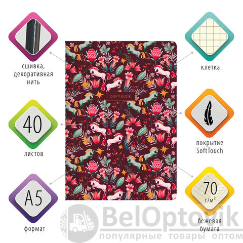 Общая тетрадь формата А5 содержит 40 листов с линовкой в клетку. Сшивка плотно соединяет листы. Обложка изготовлена из высококачественного импортного картона с двусторонней запечаткой, что придает тетради изысканный и неповторимый стиль. Специальное покрытие "SoftTouch" с повышенными тактильными свойствами придает обложке мягкий, бархатистый эффект. Внутренний блок - тонированная офсетная бумага цвета слоновой кости плотностью 70 г/м2.