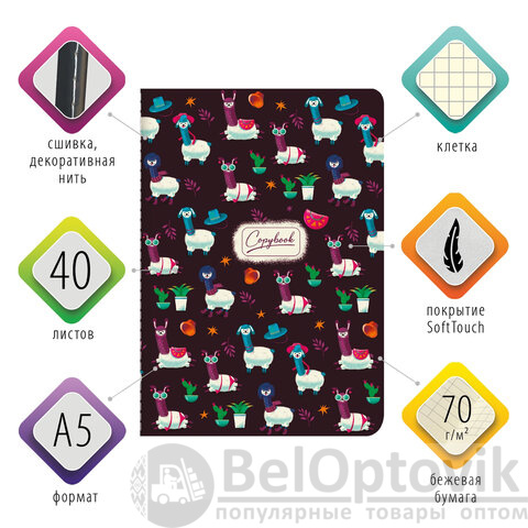Тетрадь 40 л. в клетку обложка SoftTouch, бежевая бумага 70 г/м2, сшивка, А5 (147х210 мм), ЗАБАВНЫЕ ЛАМЫ, BRAUBERG, 403786