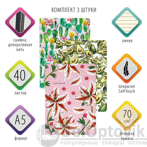Тетради 40 л. в линию обложка SoftTouch, НАБОР 3 шт., бежевая бумага 70 г/м2, сшивка, А5 (147х210 мм), FLORA, BRAUBERG, 403798