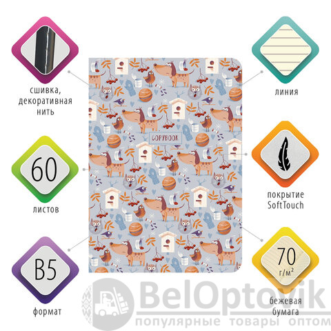 Общая тетрадь формата B5 содержит 60 листов с линовкой в линию. Сшивка плотно соединяет листы. Обложка изготовлена из высококачественного импортного картона с двусторонней запечаткой, что придает тетради изысканный и неповторимый стиль. Специальное покрытие "SoftTouch" с повышенными тактильными свойствами придает обложке мягкий, бархатистый эффект. Внутренний блок - тонированная офсетная бумага цвета слоновой кости плотностью 70 г/м2.