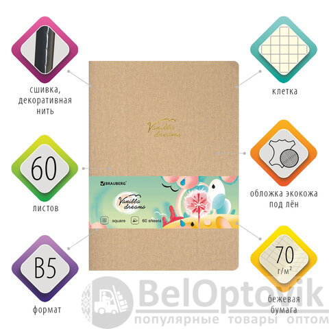 Общая тетрадь формата В5 содержит 60 листов с линовкой в клетку. Сшивка плотно соединяет листы. Обложка изготовлена из высококачественной экокожи с текстурой под лен, что придает тетради изысканный и неповторимый стиль. Внутренний блок - бежевая офсетная бумага плотностью 70 г/м2.