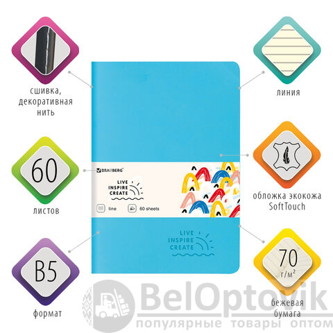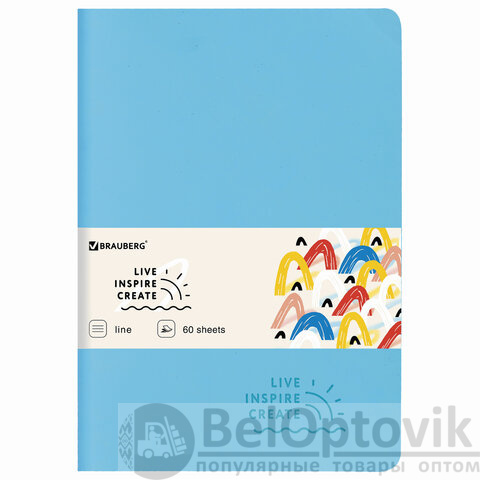 Тетрадь 60 л. в линию обложка кожзам SoftTouch, сшивка, B5 (179х250мм), ГОЛУБОЙ, BRAUBERG RAINBOW, 403886