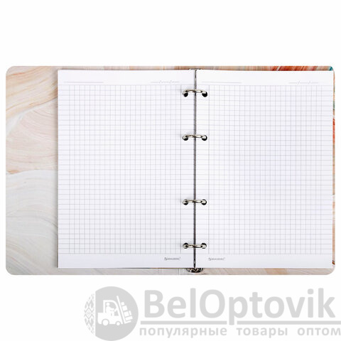 Снабжена кольцевым механизмом с 4 кольцами для подшивки сменных блоков, что позволит брать на учебу/работу всего одну тетрадь с возможностью добавлять и менять листы.