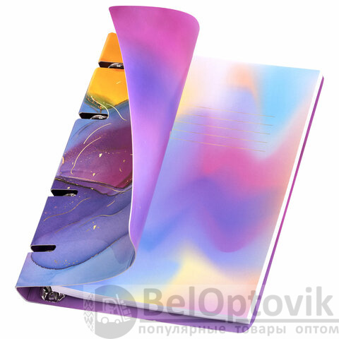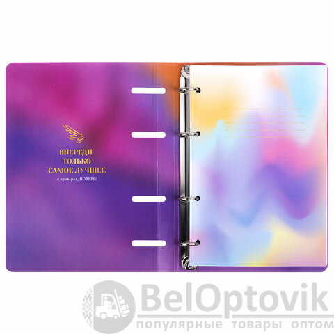 Снабжена кольцевым механизмом с 4 кольцами для подшивки сменных блоков, что позволит брать на учебу/работу всего одну тетрадь с возможностью добавлять и менять листы.