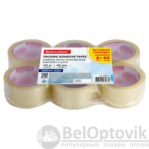 Клейкие ленты упаковочные, 48 мм х 60 м, КОМПЛЕКТ 6 шт., прозрачные, толщина 45 микрон, BRAUBERG, 440071