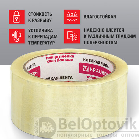 Упаковочная клейкая лента BRAUBERG активно используется в торговле, промышленности, быту и подходит для оперативной упаковки с помощью диспенсера или вручную. Отличается высокой адгезией клея (слипанием с поверхностью) и стойкостью к разрыву.