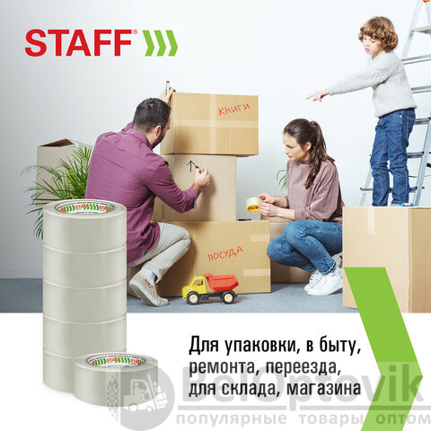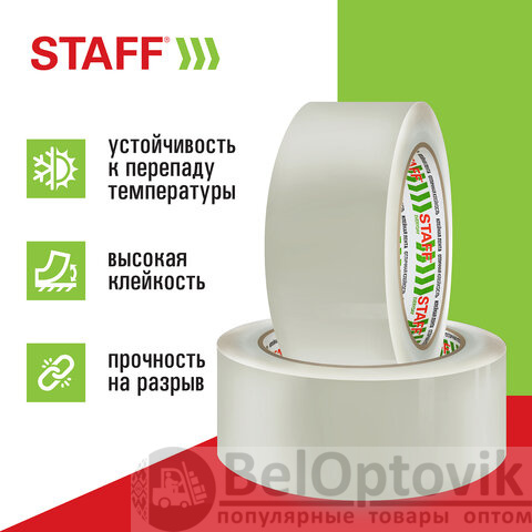 Упаковочная клейкая лента STAFF активно используется в торговле, промышленности, быту и подходит для оперативной упаковки с помощью диспенсера или вручную. Отличается высокой адгезией клея (слипанием с поверхностью) и стойкостью к разрыву.