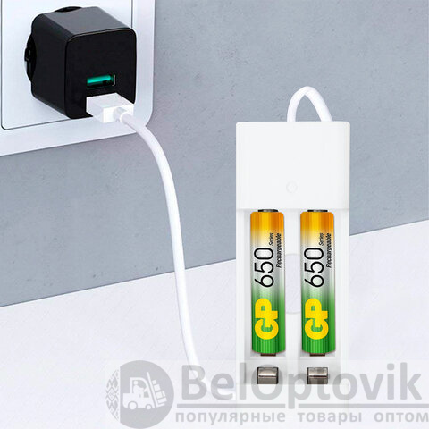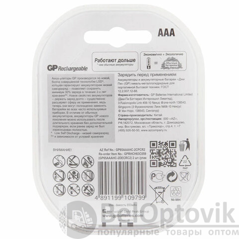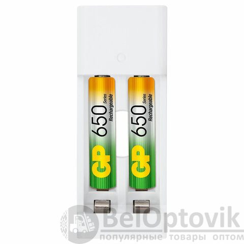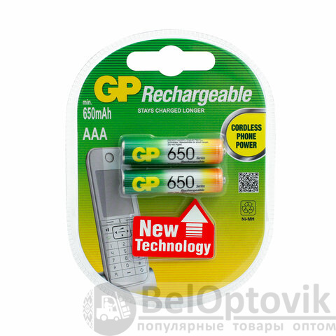 Имеют типоразмер АAА. Обладают емкостью 650 мАч и напряжением 1,2 В. Могут быть перезаряжены до 500 раз. 2 штуки в комплекте. Упакованы в блистер.