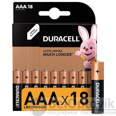 Батарейки КОМПЛЕКТ 18 шт., DURACELL Basic ОРИГИНАЛ, AAA (LR03, 24А), алкалиновые, мизинчиковые, 81483686