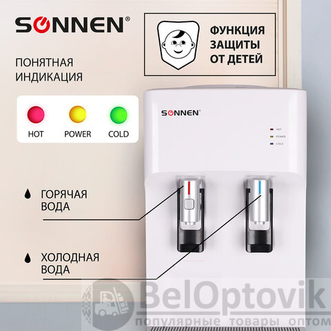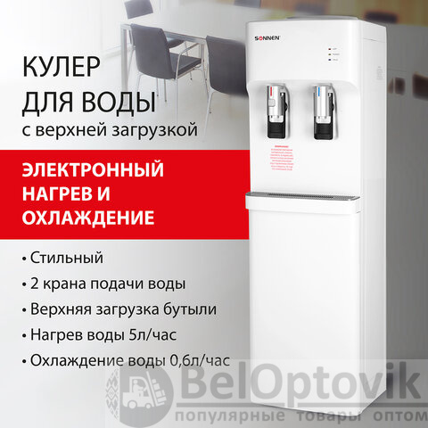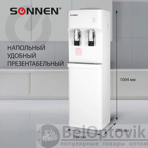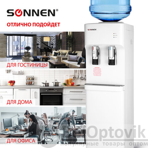 Напольный кулер SONNEN FSE-02H идеально подойдет для сотрудников и посетителей предприятий, офисов, городских и частных компаний, а также иных объектов, чтобы обеспечить питьевой холодной и горячей водой.