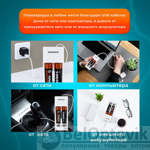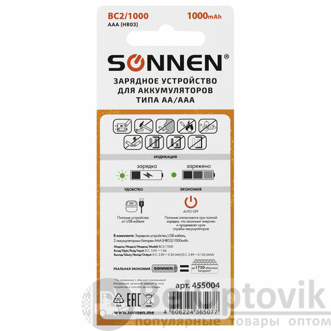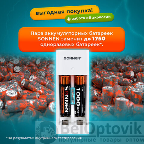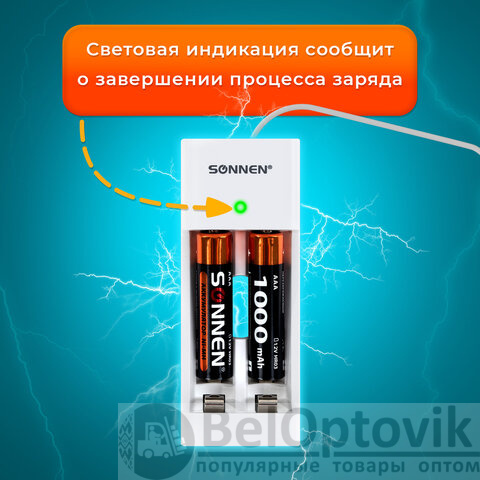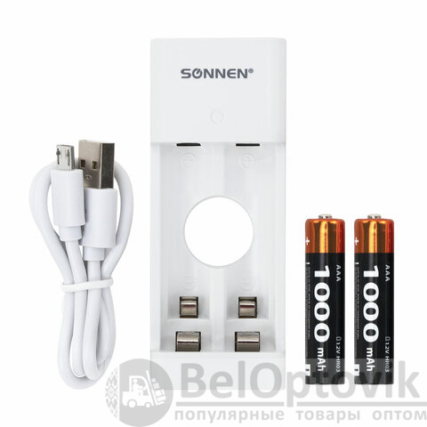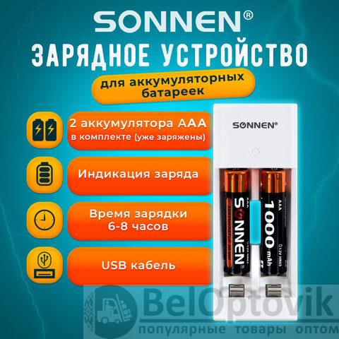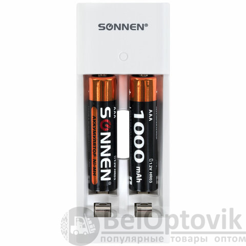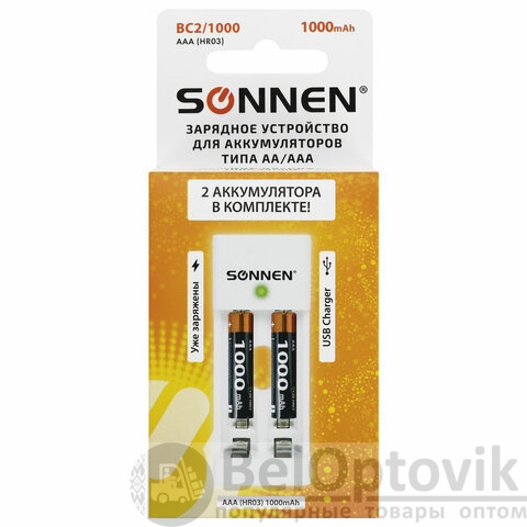 Универсальное зарядное устройство на два слота SONNEN BC2/1000 может заряжать одновременно два аккумулятора и способно работать как с "пальчиковыми" (АА), так и с "мизинчиковыми" (ААА) аккумуляторными батареями. Аккумуляторы AAA (в комплекте) предварительно заряжены.