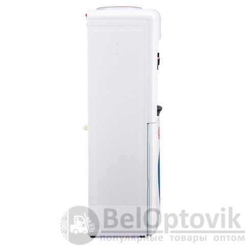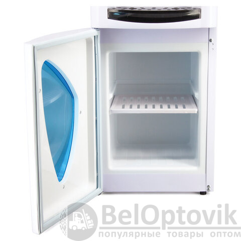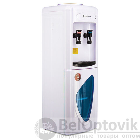 Миниатюрные для напольного водного диспенсера габариты, аккуратный внешний вид, в нижней части корпуса - небольшой встроенный шкафчик на 10 литров с полупрозрачной дверцей.