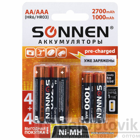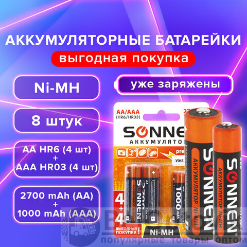 Батарейки аккумуляторные Ni-Mh пальчиковые / мизинчиковые НАБОР 8 шт. (AA+ААА) 2700/1000 mAh, SONNEN, 455612