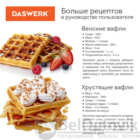 Электрическая вафельница DASWERK подходит для приготовления венских, бельгийских, овощных, сырных и других видов вафель.