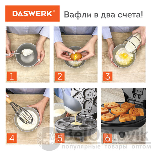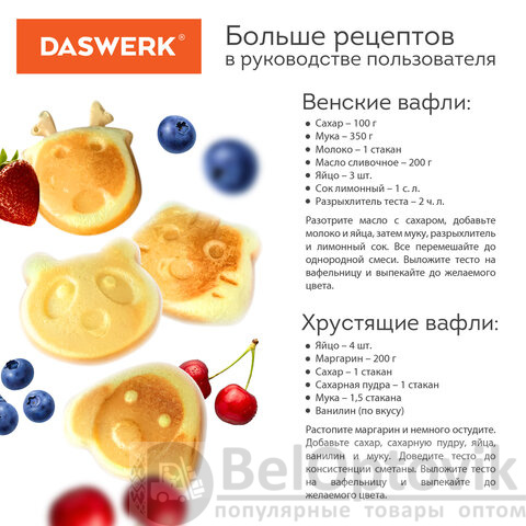 Электрическая вафельница DASWERK подходит для приготовления венских, бельгийских, овощных, сырных и других видов вафель.