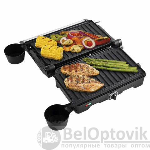 Специальное антипригарное покрытие панелей позволяет не только обжаривать различные ингредиенты без добавления масла, но и способствует легкому очищению устройства после эксплуатации. В комплектации предусмотрено наличие двух съемных контейнеров для сбора жидкости.
