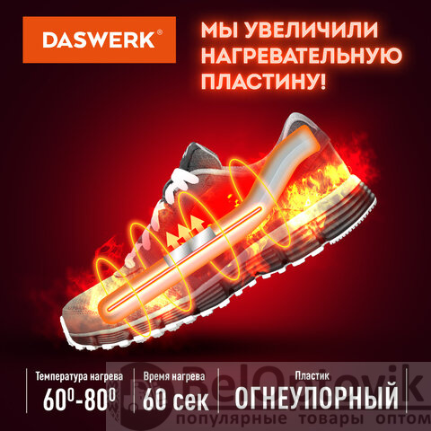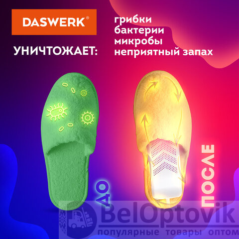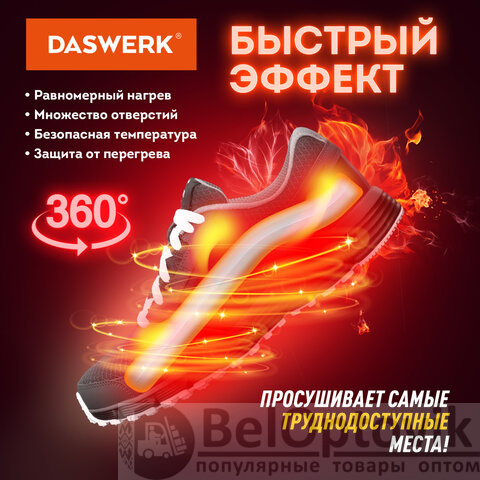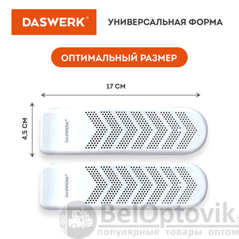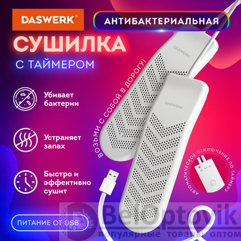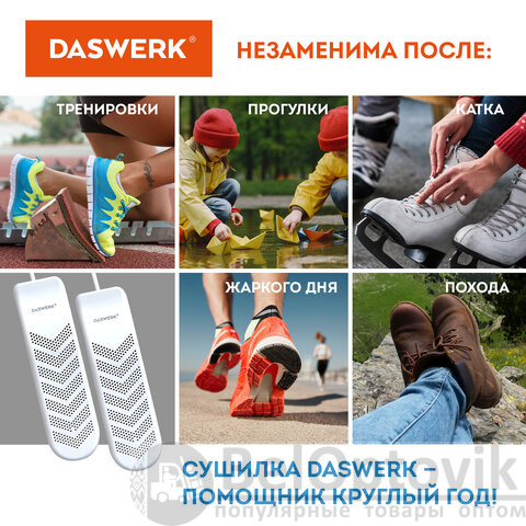 Сушилка для обуви DASWERK создана для бережного и безопасного ухода за обувью. Особая технология нагрева уничтожает неприятный запах и дезинфицирует обувь, а эргономичная форма позволяет просушить даже самые труднодоступные места.