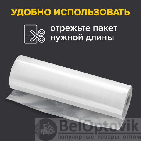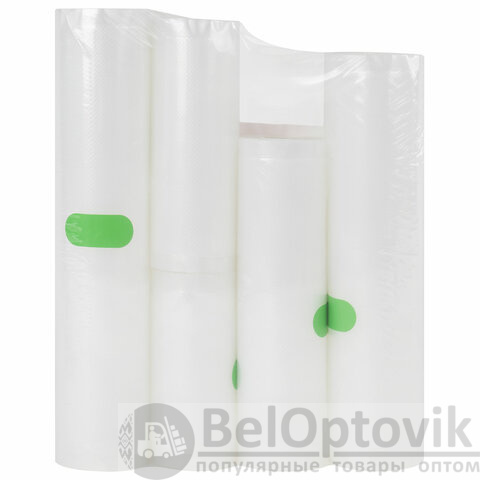 В комплекте 5 рулонов для вакуумного упаковщика, они отличаются по ширине пленки: 12 / 15 / 20 / 25 / 28 см. Поэтому нужный размер можно выбрать, не тратя лишнюю пленку и сохраняя место. Вы также можете выбрать длину пакета – для использования необходимо отрезать пленку и запаять край с помощью вакууматора.