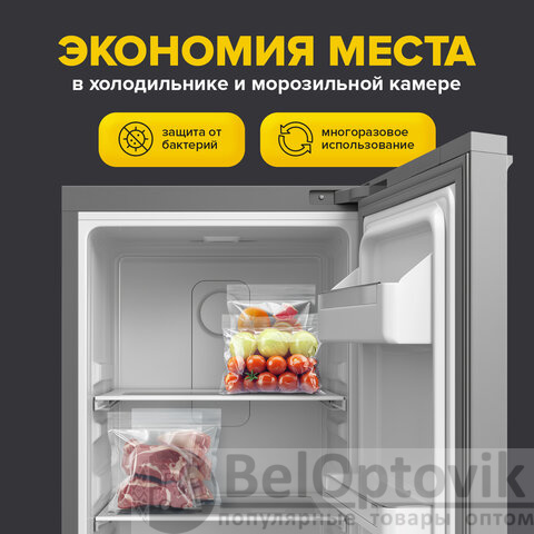 Благодаря вакуумированию продукты занимают меньше места, что идеально в условиях ограниченного пространства. В пакетах можно при необходимости хранить не только продукты, но и небольшие вещи.