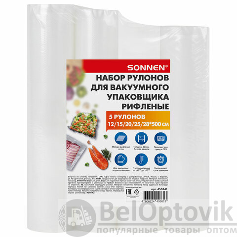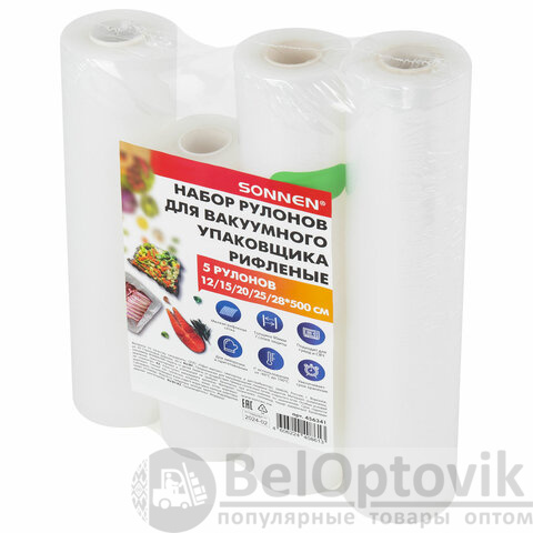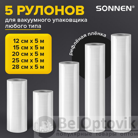 Рулоны для вакуумного упаковщика, рифленые, НАБОР 5 шт. (12 / 15 / 20 / 25 / 28 см х 500 см), SONNEN, 456341