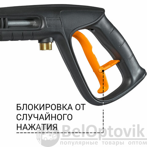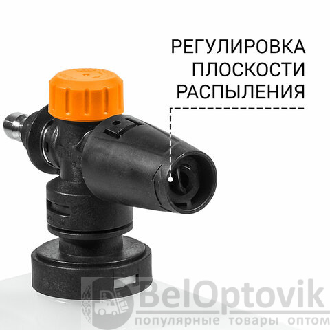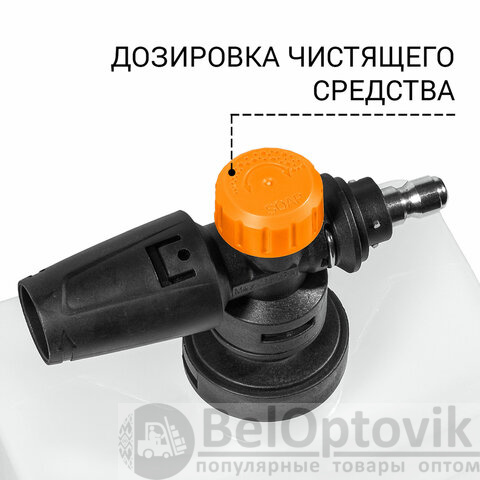 Мойку можно подключить к водопроводу или отдельной емкости, а также использовать моющее средство. В комплекте идет пеногенератор, который создает густую пену для эффективного удаления грязи, бережно относясь к лакокрасочным покрытиям.