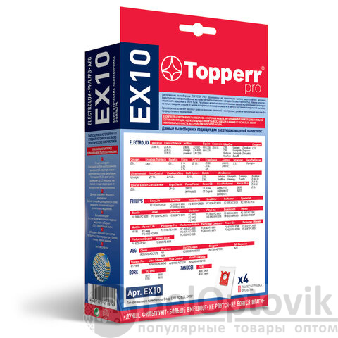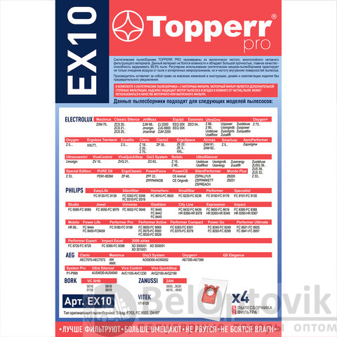 Мешок для пылесоса (пылесборник) синтетический TOPPERR EX10, ELECTROLUX, PHILIPS, AEG, КОМПЛЕКТ 4 шт., 1404