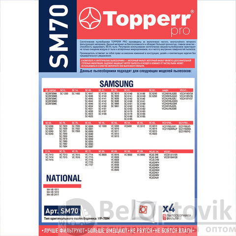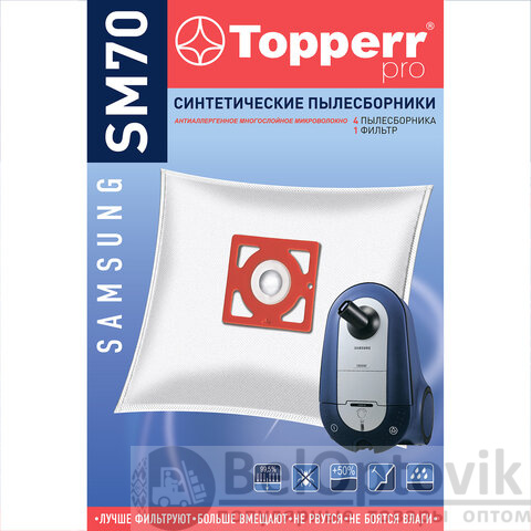 Улучшите эффективность уборки вашего пылесоса с синтетическими мешками-пылесборниками Topper SM 70! Эти мешки обладают высокой пылевой ёмкостью и обеспечивают надёжную фильтрацию благодаря многокамерной структуре. Забудьте про пыль и мусор с Topper SM 70!