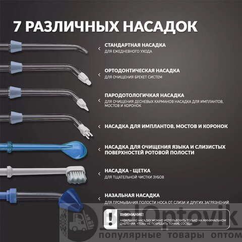 В комплектацию к портативному ирригатору AsiaCare PRO+ входят 7 функциональных насадок для решения разных проблем: