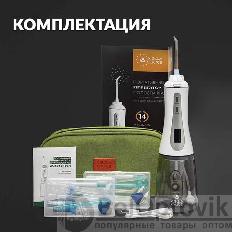 Ирригатор для полости рта ASIACARE PRO+, портативный, емкость резервуара 0,35 л, 14 насадок, белый, Asia_30