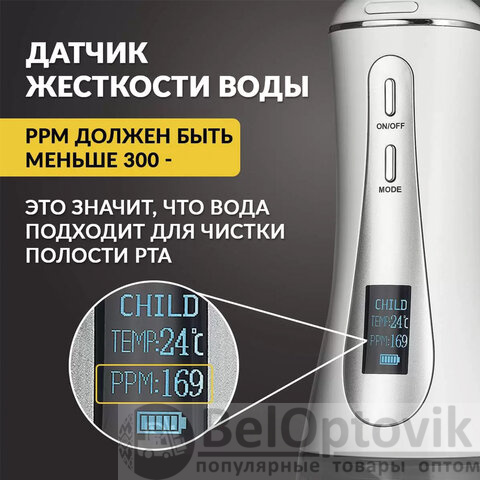 Ирригатор оснащен датчиком жесткости воды и датчиком температуры воды. Эти показатели важны для правильной работы аппарата и качественной процедуры очистки.