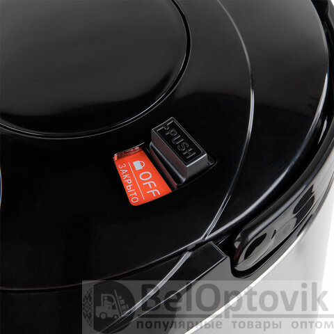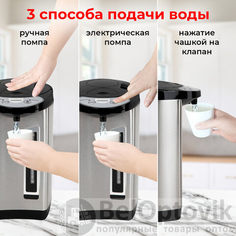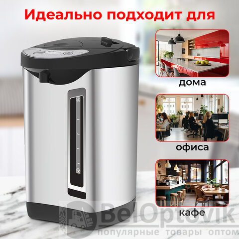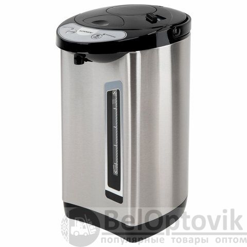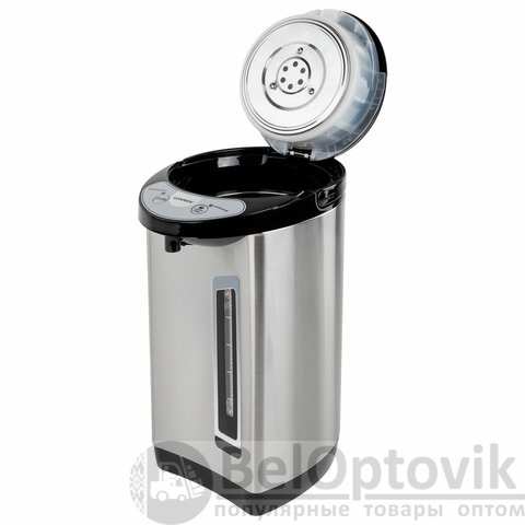 На корпусе размещена шкала уровня воды для контроля объема жидкости. Корпус дополнен прочной ручкой для удобного переноса устройства. Модель имеет вращающуюся подставку – вы можете поворачивать термопот в любую сторону, не поднимая над столом.