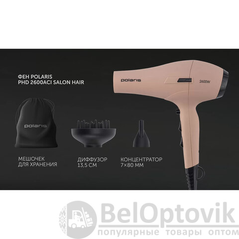 Фен POLARIS PHD 2600ACi Salon Hair - это профессиональный инструмент для сушки и укладки волос с мощностью 2600 Вт. Он оснащен функцией ионизации, которая предотвращает статическое электричество на волосах и делает их блестящими и послушными.