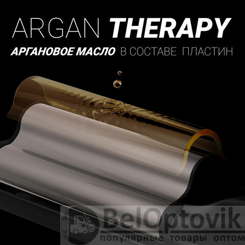 Argan Therapy – пластины обогащены Аргановым маслом. При нагреве волосы становятся восприимчивы к внешнему воздействию и Аргановое масло внедряется в структуру волос, позволяя им оставаться здоровыми и приобрести естественный блеск.