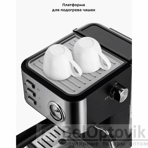 Управление интуитивно понятное: кнопки выбора режимов "Эспрессо" и "Двойной эспрессо", а также поворотный регулятор для подачи горячей воды и пара. Резервуар для воды объёмом 0,9 л легко снимается и наполняется, а крышка позволяет доливать воду без демонтажа. На платформе для подогрева чашек можно заранее прогреть фильтр, рожок и посуду – это улучшает вкус и сохраняет температуру напитка дольше.