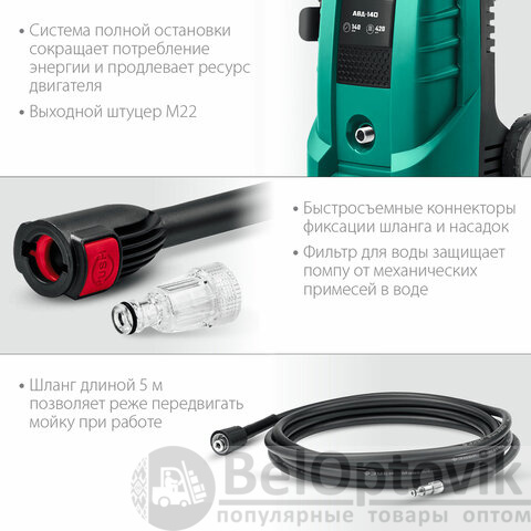 Благодаря системе полной остановки помпа не работает при не нажатом пистолете – это экономит воду и ресурс изделия при неизбежных паузах в работе.