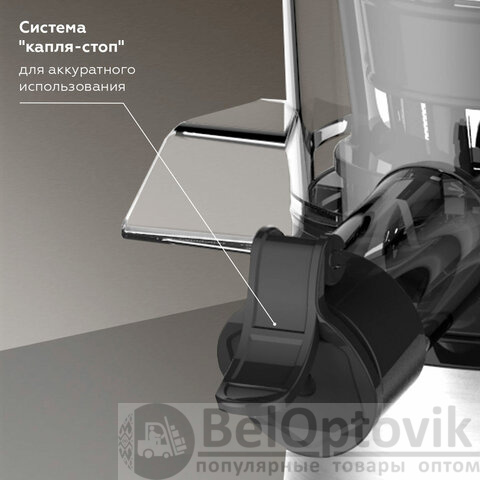 Система капля-стоп и прорезиненные ножки делают эксплуатацию соковыжималки комфортной, а защита от перегрева, перегрузки и блокировка при неверной сборке и случайном включении обеспечивают надёжность, долговечность и высокую гигиеничность аппарата.