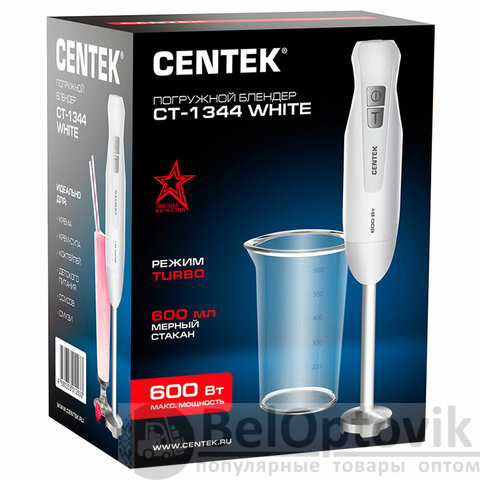 Блендер погружной CENTEK CT-1344, 600 Вт, 2 скорости, 1 насадка, стакан, белый