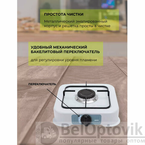 Газовая плитка CENTEK CT-1520 оснащена белой эмалированной стальной варочной панелью с алюминиевой газовой горелкой.